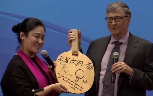“20多年前,我第一次造访北京大学。随后在2007年,我十分荣幸地被北大授予荣誉校董称号。而其中一段我最喜欢的个人经历也与北大有关——那是在2008年北京奥运会期间,我在北大体育馆观看了一场乒乓球半决赛,比赛的双方是中国队和韩国队。相信很多人都还记得,在那届奥运会上,中国队包揽了乒乓球项目的四枚金牌,另外还有两枚银牌和两枚铜牌。对于任何一个像我一样热爱乒乓球的发烧友来说,能亲眼见证这一历史时刻,感觉真是太棒了。”比尔·盖茨微信公众号在预报直播秀时如此写道。当天演讲结束,北大赠予的礼物就是乒乓球拍,球拍上用中文写着:来北大约一场。