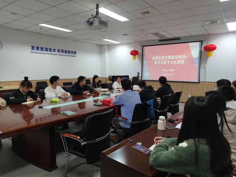 2023年12月5日晚,能源学院本科生党支部开展十二月固定党日+学习,支部邀请了能源学院党委副书记罗俊峰为各位党员领学习近平文化思想,本科生党支部的15名正式党员、预备党员参加学习。