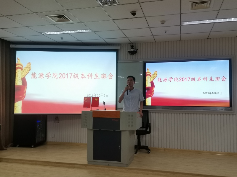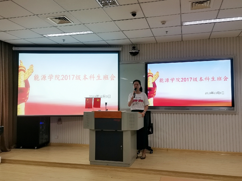 2019年10月9日,能源先锋党支部成员2017级本科生班主任曾宪海老师、曹留煊老师和辅导员黄诗雨老师组织2017级本科生召开“我与祖国共成长”主题班会,通过回顾庆祝新中国成立70周年活动精彩片段,分析国家能源战略发展需求,结合上学年学生学习生活情况,对学生未来规划提出意见和建议并进行沟通交流。