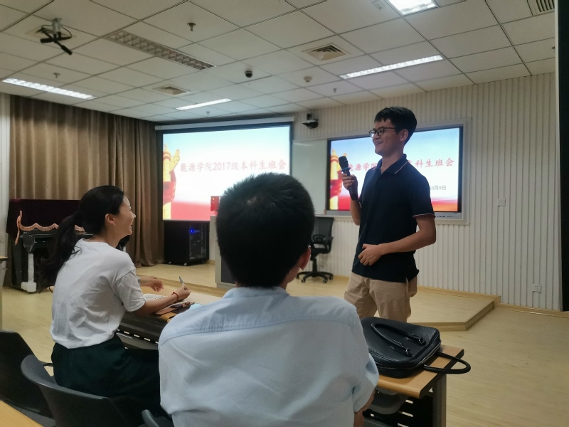 接着,曹留煊老师和曾宪海老师分享了未来社会发展趋势与国家能源环境现状,结合上学年2017级学生学业的总体情况,教导大家要学会确立短期和长远目标,有助于同学们更好地规划之后的学习生活,并勉励同学们不断提高自身能力以适应国家发展需求。