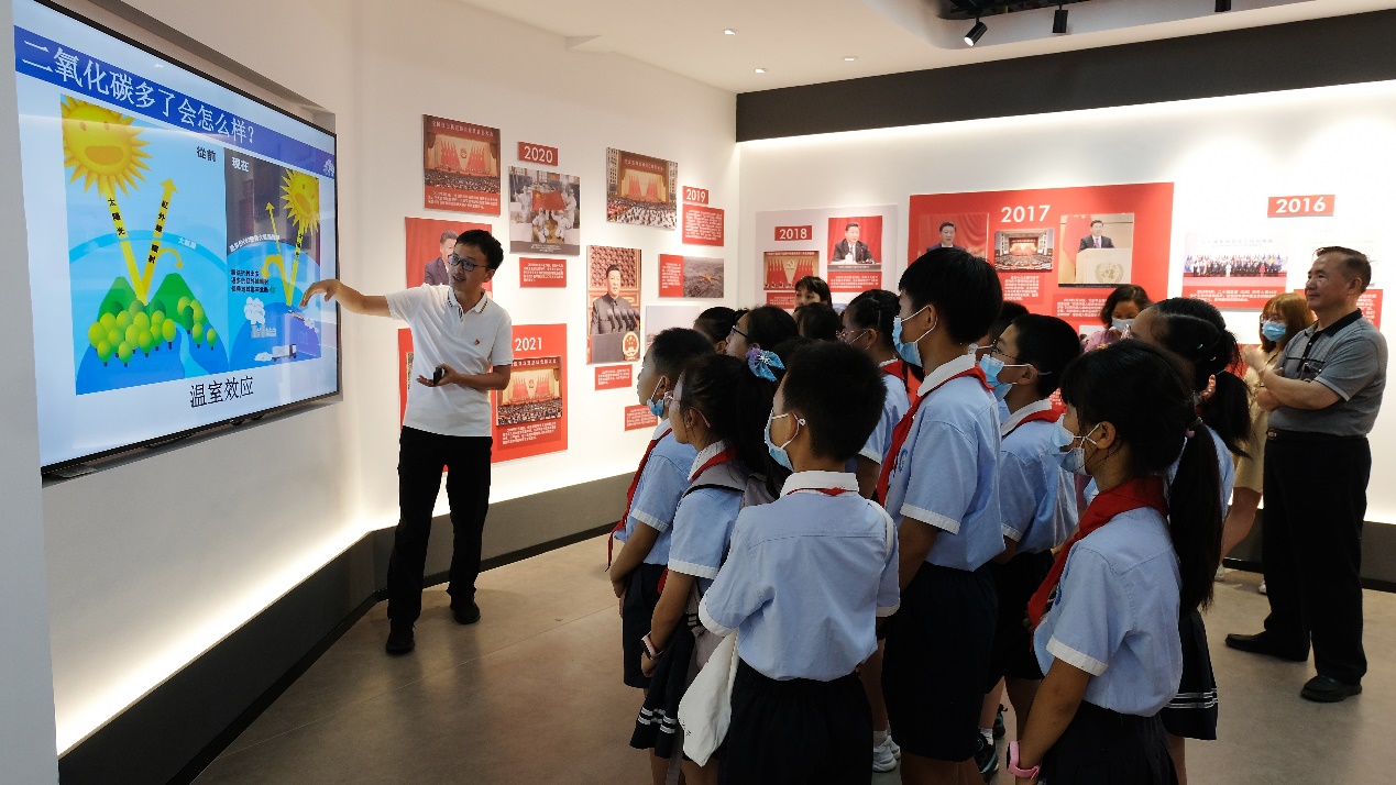 林志彬为现场的少先队员及党员们生动讲解《碳中和的那些事儿》。为了让少先队员们更好的理解什么是“碳中和”,林志彬用简洁有趣的语言,结合图文并茂的简报向在场的每一人诠释“碳中和”的意义。林志彬提到,“中国采取行动积极应对气候变化,尽早达峰迈向近零碳排放,这不仅是国际责任担当,也是美丽中国建设的需要和保障。”在场的少先队员们纷纷表示要集结在星星火炬旗帜下,热爱中国共产党,热爱祖国,热爱人民,争做节能减排小卫士。