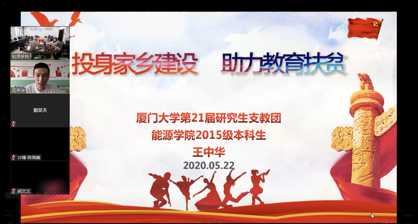 为进一步深化同学们对打赢脱贫攻坚战重大意义的认识,增强责任担当,学院党委在5月22日精心组织了一场别开生面的“云”上分享会,邀请学院2015级本科生,目前正在宁夏回族自治区海原县关桥中学支教的王中华同学为全体硕博士、本科生党员们作主题为《投身家乡建设 助力教育扶贫》的经验分享。经验分享会由院党委副书记唐拥华主持,院党委副书记罗俊峰、辅导员、党务秘书参加学习。