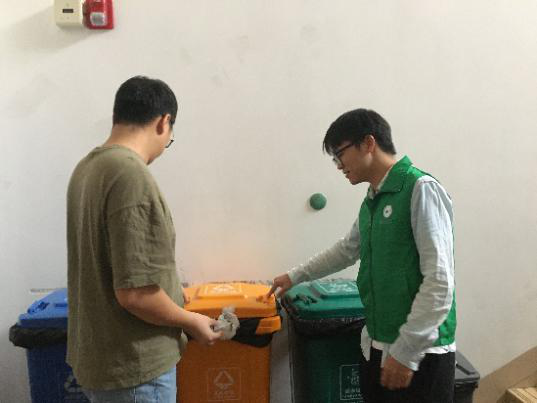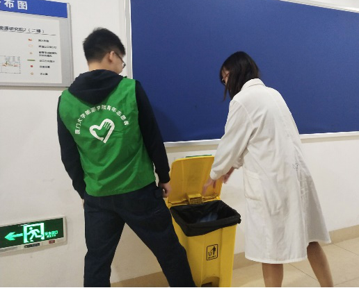 党支部书记李郁昱提前划分责任区域,制定值日时间表。上午10点,党员志愿者们身穿绿马甲,兵分多路,在学院各个楼层的垃圾桶边上站岗,耐心指导路过的同学正确分类垃圾。同学们在党员志愿者的监督和耐心的指导下,了解了垃圾分类相关知识,意识到垃圾分类的重要性,也提高了垃圾分类的自觉性。