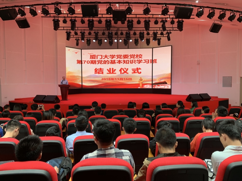 11月16日中午,由能源学院党委承办的厦门大学党委党校第70期(学生)党的基本知识学习班(翔安校区)结业式顺利举行。厦门大学学生工作部(处)副部(处)长、翔安校区学生办主任张清榕、环境与生态学院副书记毛通双、医学院党委副书记马龙、公共卫生学院党委副书记杨机像、海外教育学院/国际学院党委副书记伍伟平、航空航天学院党委副书记郑镇锋、海洋与地球学院党委副书记郑碧娇以及各学院带队老师和187名学员参加仪式。结业仪式由能源学院党委副书记马兆海主持。