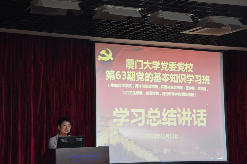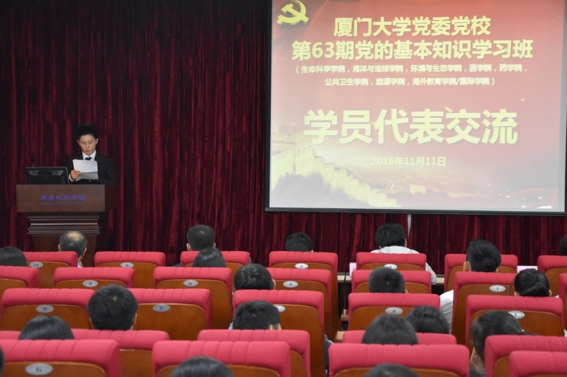 11月11日中午,厦门大学党委党校第63期党的基本知识学习班(翔安校区)结业仪式在翔安校区黄朝阳楼报告厅举行。校学生工作处副处长、翔安校区学生办主任张清榕,海外教育/国际学院党委副书记伍伟平,公共卫生学院党委副书记黄兆君,医学院党委副书记马龙,环境与生态学院党委副书记周克夫等出席结业式。结业式由能源学院党委副书记马兆海主持。
