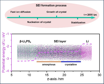 该工作利用机器学习方法基于DFT计算数据成功训练了Li|ꞵ-Li3PS4界面反应模型势函数。构建了超级晶胞将模型尺寸沿垂直于界面方向扩大至40 nm以支撑模拟实验尺寸下的SEI演变过程。通过DeepMD模拟锂金属与ꞵ-Li3PS4之间SEI的形成和生长过程,发现SEI的生长经历了界面元素互扩散,Li2S成核,Li2S核生长和界面稳定四个阶段。并对SEI的结构、组分和形貌做详细的分析,模拟结果与实验结果高度一致,为理解全固态电池中SEI复杂的生长过程提供了原子尺度上的新视角。作为一种高效且准确的计算解决方案,基于DFT结合机器学习方法的大尺度分子动力学模拟能够极大地扩展模型尺寸和延长模拟时间,从而为我们提供在大尺度下去研究和观测电池关键性问题的机会。