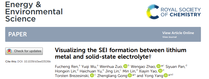 近日,厦门大学杨勇教授和龚正良教授团队在锂金属全固态电池中SEI形成热力学和动力学动态演化关键性问题研究中取得新进展,相关成果以“Visualizing the SEI Formation Between Lithium Metal and Solid-State Electrolyte” 为题发表于Energy & Environmental Science。