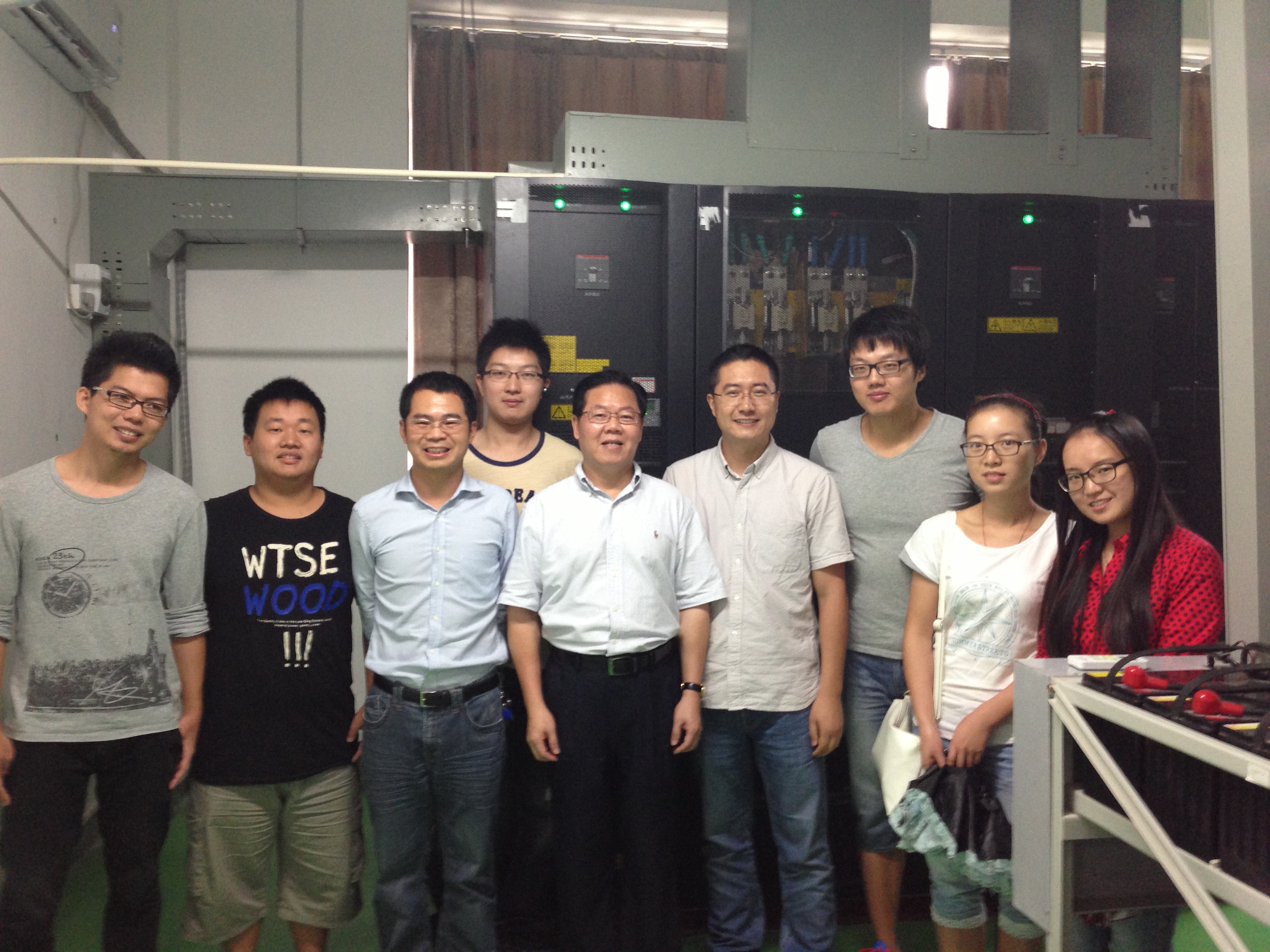 郭奇勋和本项目骨干教师孟超向朱校长一行汇报了直流微电网示范项目的建设情况,朱校长对直流微电网示范项目建设所取得的成绩给予了充分肯定,认为本项目理念新颖、技术先进、实用性强,具有很好的示范和引领作用。朱校长还详细了解了直流微电网系统的相关设备和主要参数,他勉励大家再接再厉,争取做出更多的创新性成果,并推向产业化。朱校长非常愉快地和能源学院在场师生合影留念。