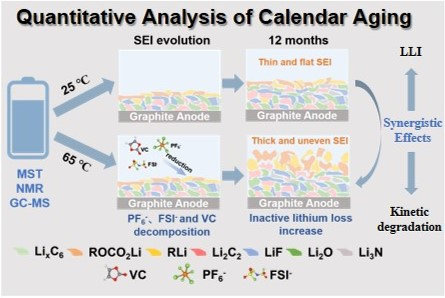 日历老化机制量化解析,对于研发适用于大规模储能系统与电动汽车的长寿命锂离子电池至关重要。近年来,针对高温存储条件下锂离子电池的日历老化行为及其老化机制的研究普遍认为温度升高会加速副反应的发生,进而促使SEI膜生长。然而,受限于定量表征技术,不同存储温度下SEI膜的形成及结构演变规律目前仍未被充分阐明。