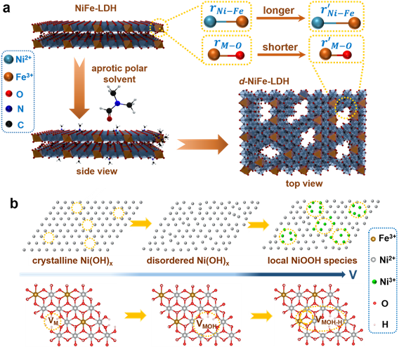 NiFe-LDH是常用的碱性电解水析氧(OER)电催化剂。已有研究表明OER过程中NiFe-LDH发生显著表面重构,生成NiOOH等表面高价态物种。但是,在OER高电压影响下,该表面重构过程究竟仅是催化剂不可避免的电氧化,还是OER本征活性位点,当前仍有争议。同时,NiFe-LDH中的缺陷可明显改善其OER电催化性能。然而,空位缺陷具体结构,缺陷与电催化剂表面重构关系尚不明确。