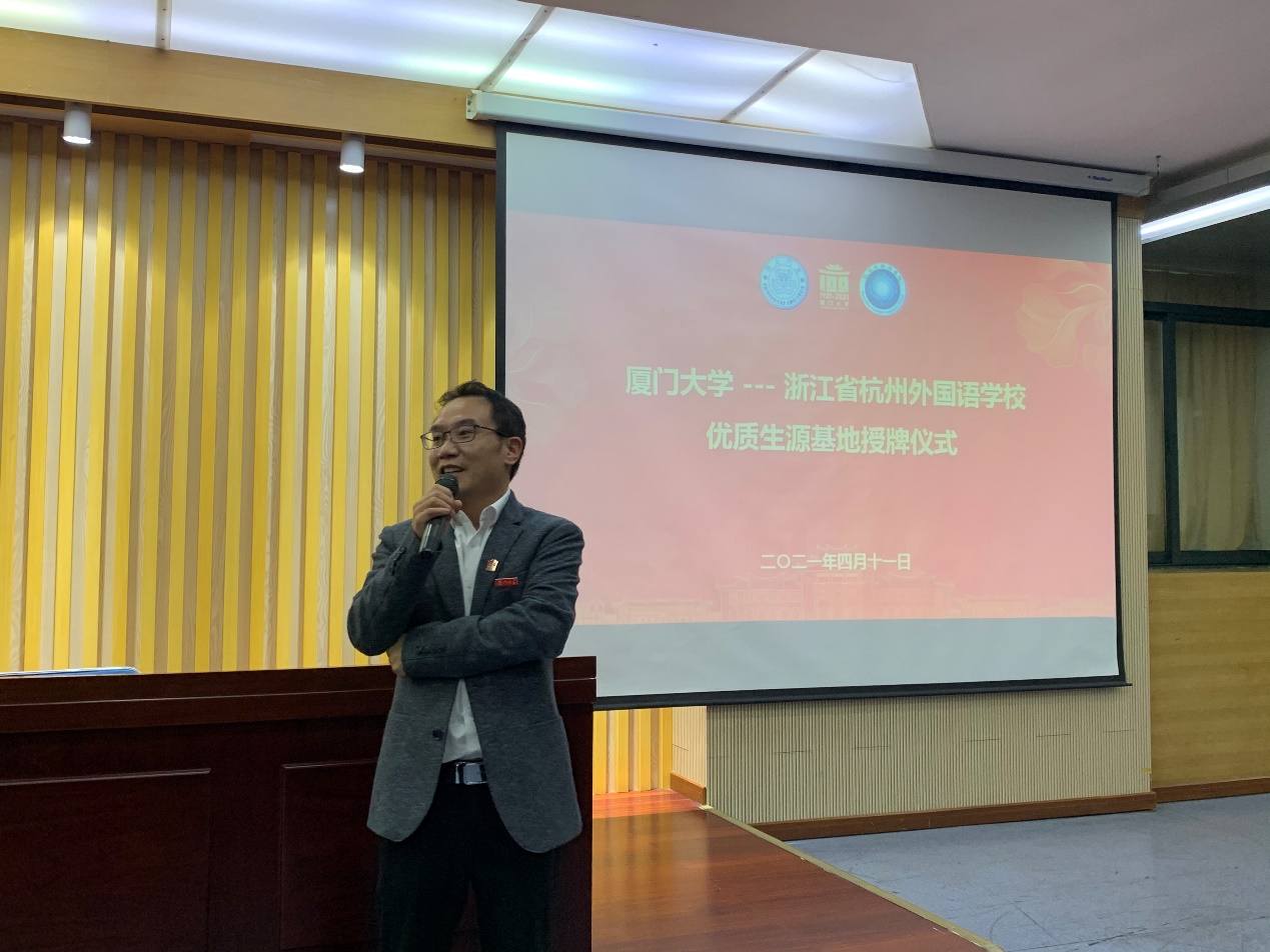 4月11日,我校能源学院副院长郑志锋教授、副院长赵英汝教授等一行人赴杭州外国语学校举行“优质生源基地”授牌仪式。杭州外国语学校副校长张俊峰老师、学生处主任朱伟杰老师和高一师生出席了本次活动。