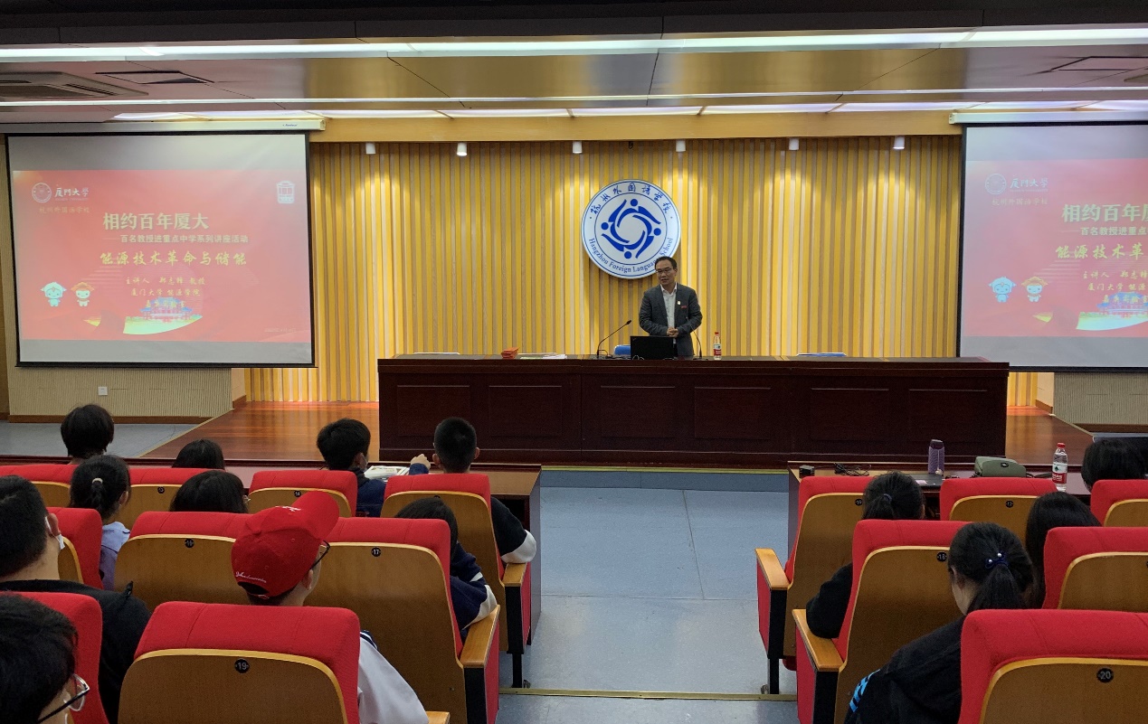 郑志锋教授结合厦门大学能源学院学科背景,集中介绍了世界能源现状、中国能源战略、能源技术革命、储能基本概念,诙谐生动地为同学们科普了世界储能行业发展现状与趋势。随后,赵英汝教授向同学们以外国语学校学子擅长的英语及日常生活场景为切入点,深入浅出地介绍了城市能源系统的应用场景、分层模型、实施案例等智慧能源学科前沿知识。