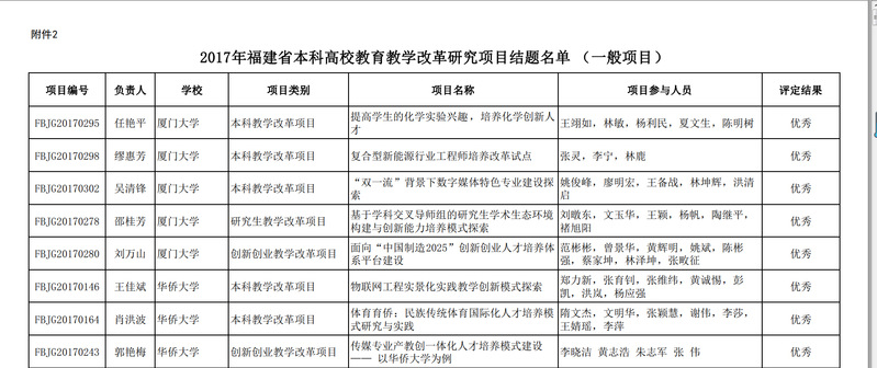 近日,福建省教育厅公示了2017年省级教改项目结题名单。其中,我院缪惠芳老师主持的“复合型新能源行业工程师培养改革试点”教学改革项目顺利完成结题,并获得优秀评定。该项目同时在2018年被列入教育部首批“新工科”研究与实践名单。