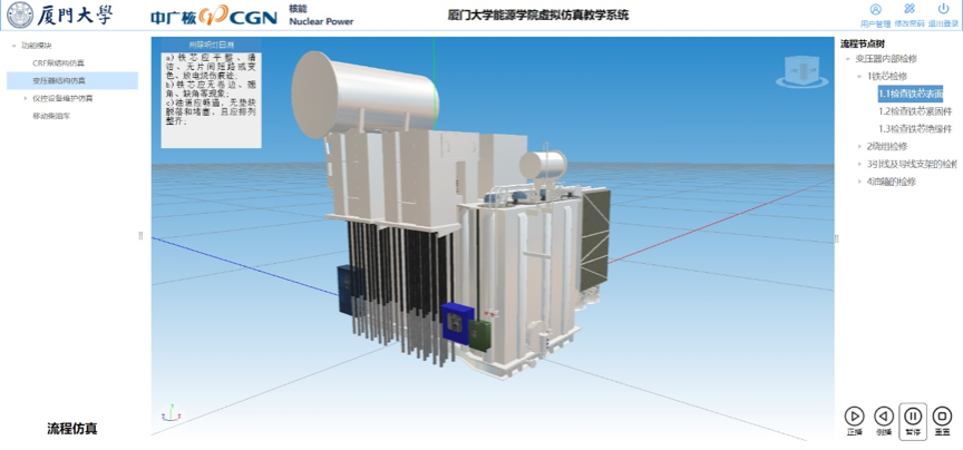 核电装备虚拟仿真实验教学项目基于真实核电装备进行三维建模,可视化的再现核电现场实操场景,以三维模型逼真展示了核电装备结构原理、故障排除及操作流程。目前,已建成的实验项目包括:CRF泵结构仿真、变压器结构仿真、仪控设备维护仿真、移动柴油车操作仿真。通过该虚拟仿真实验课程的学习,极大弥补缺乏大型能源装备的薄弱点,学生可以在三维场景中增加沉浸感,快速掌握相关能源装备的结构原理、故障排除操作流程等知识,有力提升学生的工程实践能力培养。本项目将同时面向社会开放,鼓励核电企业员工在线使用该平台开展相关的技能培训。