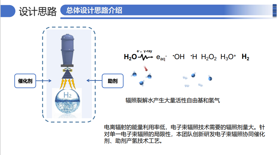 “辐光跃氢-电子束耦合新型催化剂协同制氢”由我院缪惠芳教授、曹留烜副教授担任指导老师,团队成员由周宇轩、雷雨电、麻诺文、邓雅兰、肖海鹏五名研究生组成。团队通过创新的辐照催化耦合工艺策略,使得辐照中自由基实现定向重组,极大得提升氢气产率,其新型材料克服了传统催化剂中对应用水层厚度的严格要求,能够实现常规水体系中的氢气产率提高近40倍的卓越性能;设计集装箱式可移动电子束制氢装置,具有高效的产氢率,可便携式移动,从根源上破除氢气运输难、储存难的问题。
