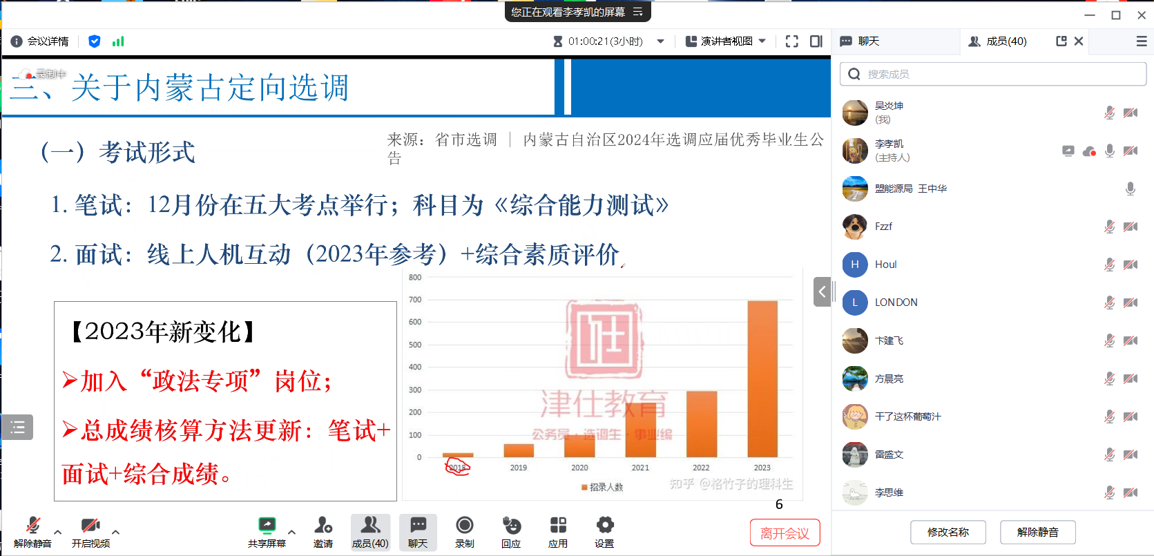 现就职于阿拉善盟能源局的王中华师兄,首先从当下就业环境分析,建议同学们摒弃学生思维,树立正确观念,认识自己,认清岗位,综合思考自己能否接受进入体制。接着介绍备战选调的准备工作,并以自身蒙古定向选调为例,为同学们备考提出建议,尽可能做到“天时地利人和”的条件。最后对于阿拉善盟能源局基层的工作生活,他从坚定信念、融入基层、积极作为等方面介绍了自己对于选调生生活的感悟。