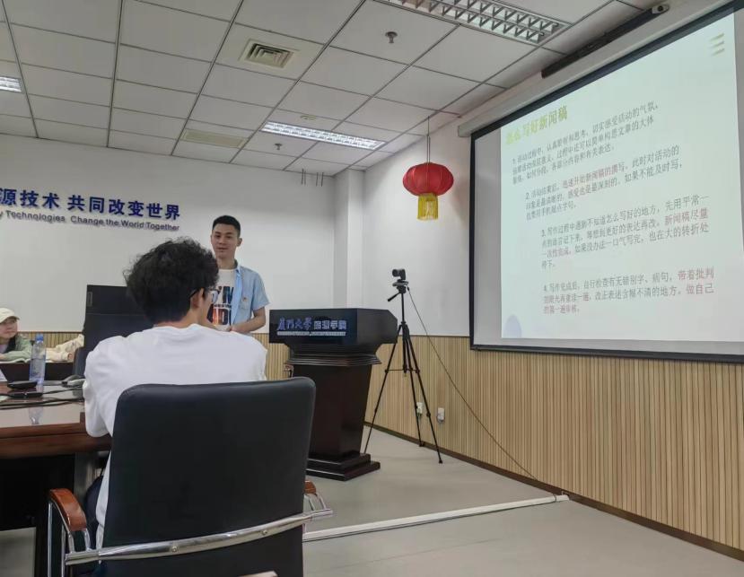 5月14日下午四点,学院宣传中心执行主任,2020级本科生张子骏为各位学员讲解了新闻稿的写作要求和技巧,他建议学员们多读、多练、多改、多思考,在不断的学习中提升自己的写作能力。曾任厦门大学能源学院团总支书记的2019级学长陈登煌为学员们传授自己在学生工作中的经验和方法。参与培训的干事们对于学生工作有了更全面的认识和理解,掌握了提高工作效率的小技巧,对于如何平衡学习、科研、工作三者关系有所启发。两位学长的分享可以说是干货满满,各位学员收获多多。