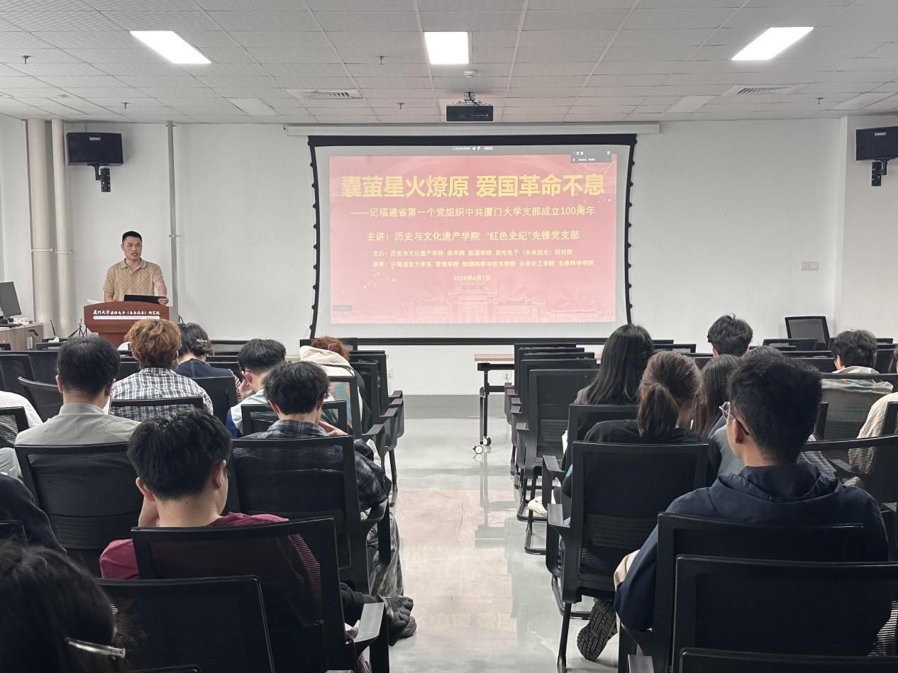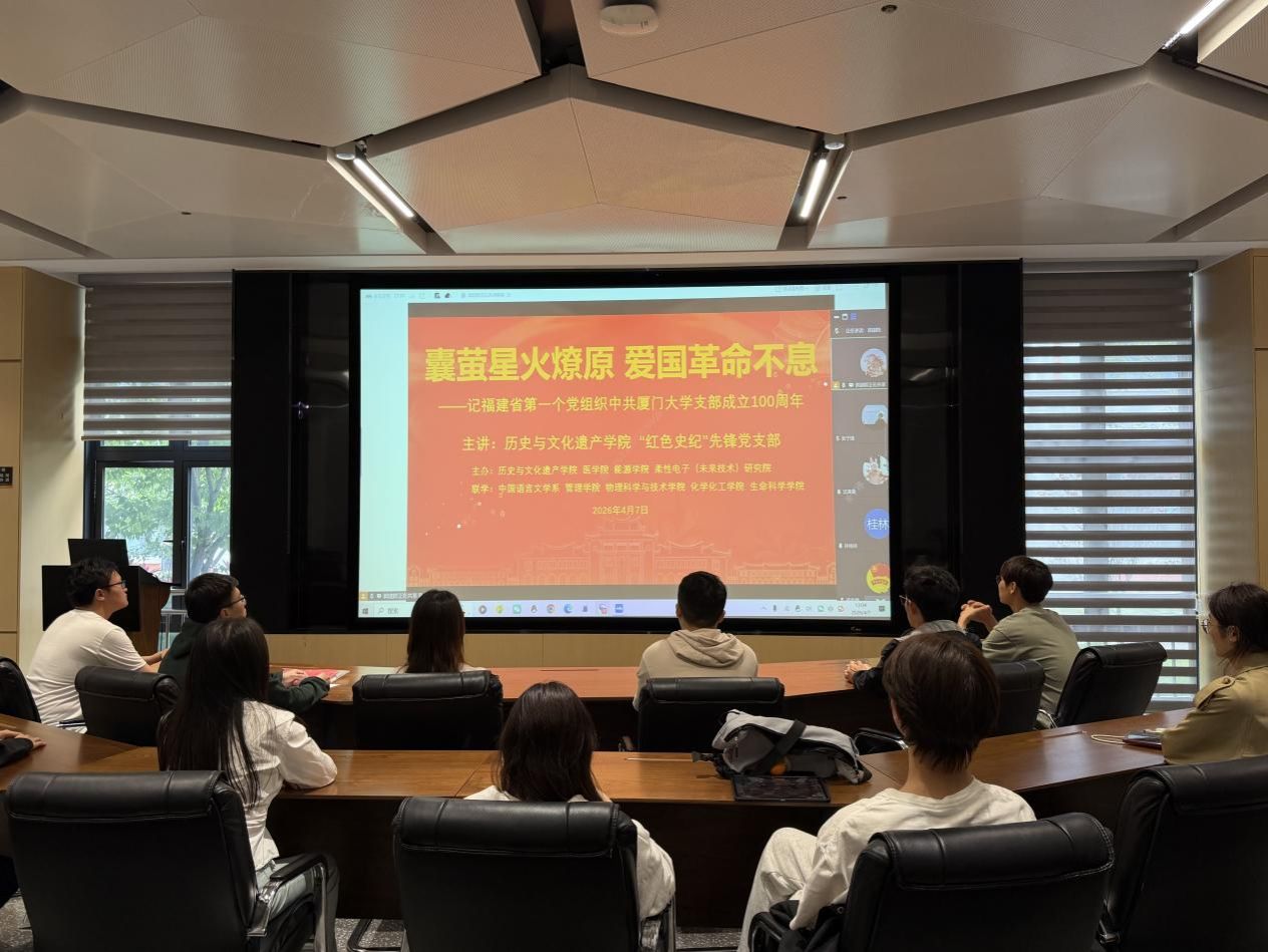 为传承红色基因,弘扬爱国主义精神,深化思想政治引领,在厦门大学建校105周年、福建省第一个党组织中共厦门大学支部成立100周年之际,4月7日中午,医学院、能源学院、柔性电子(未来技术)研究院联合举办春季学期团校暨学生骨干培训班第三讲,250余名青年学子以“囊萤星火燎原 爱国革命不息”为主题,开展党团共建、支部联学活动。本次活动采用线上线下相结合形式,联合历史与文化遗产学院共同主办,中国语言文学系、管理学院、物理科学与技术学院、化学化工学院、生命科学学院等院系的学生党支部参与联学。活动由柔性电子(未来技术)研究院团委书记郭建群主持。