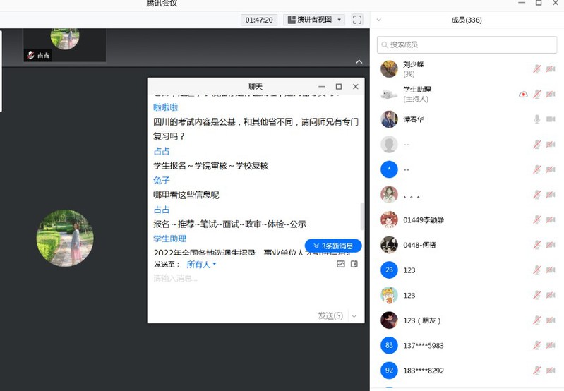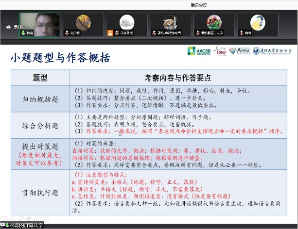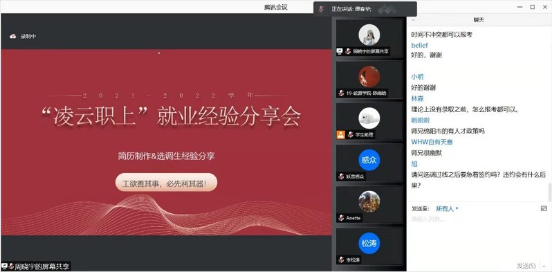 讲座的经验交流分享会由2021届四川省定向选调生谭春华、福建省定向选调生林森两位师兄分享选调过程中的准备工作及感悟。林森师兄叙述了他个人的备考过程,解读了福建省选调生的报录流程和考情,分享了他在备考过程中练习技巧及解题方法,提醒同学们要根据各省情况有针对性地准备笔试和面试;谭春华师兄则参与过多个省份的选调生考试,并且拿到高校的offer,本次讲座中他阐述了自己选择选调的心路历程,分析了选调与高校之间的优劣,以自身为例告诫同学们一定要认真备考,并结合周围选调生经历对备考过程中是否报班、如何收集资料等问题给出了中肯的建议。分享结束后,同学们积极提问,占老师和两位师兄就问题给出了详细的解答。