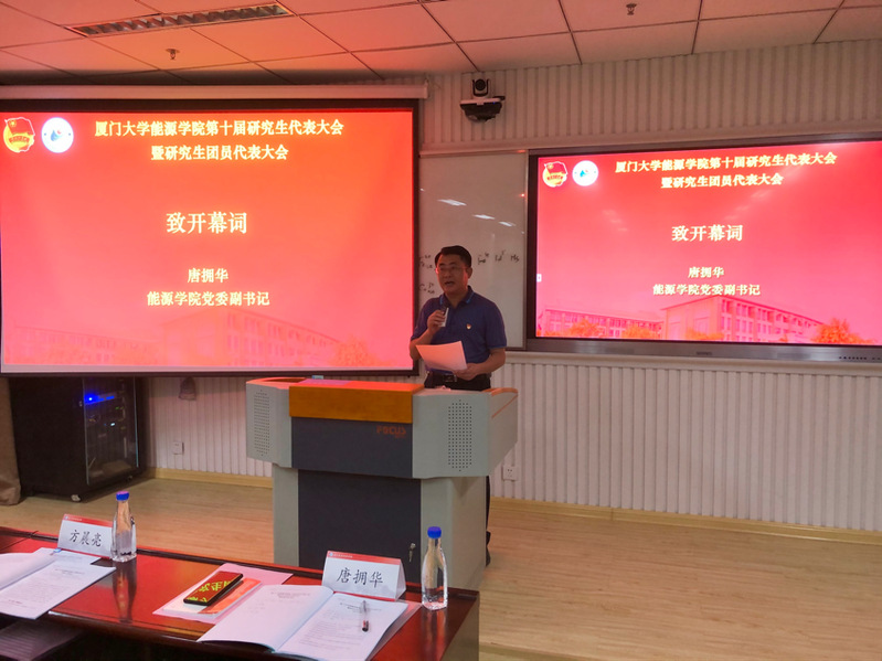11月19日晚,能源学院第十次研究生代表大会暨研究生团员代表大会在和木楼A221报告厅召开。院党委副书记唐拥华、团委书记方晨亮,第29届、第30届厦门大学校研究生会主席团成员代表,各兄弟学院研究生会主席团成员代表,能源学院第九届研究生会、团总支成员以及全院各年级研究生、研究生团员代表等参加了大会。大会由能源学院2018级硕士研究生邵坦主持。