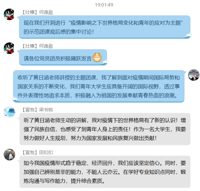 在观看完主题团课后,2019级本科生两名团支书牵头围绕变化与应对的主题展开了讨论。参会团员踊跃参与,积极发表自己的观点。不少同学认为疫情推动了霸权主义的回归,中国作为当今具有世界影响力的大国,应当坚持推进多极化,构建人类命运共同体。