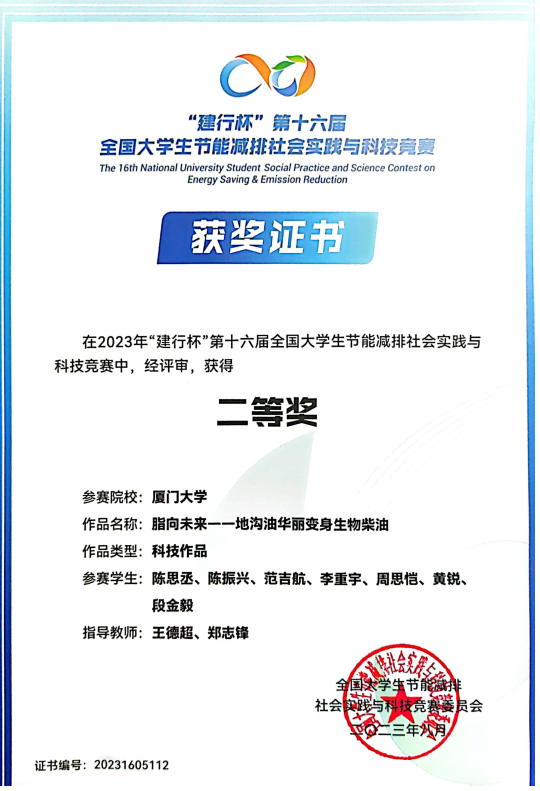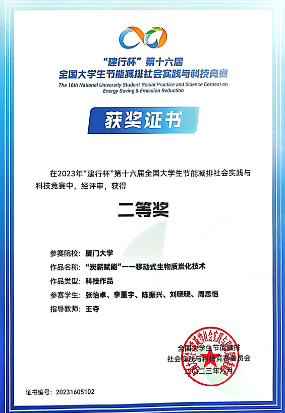 近日,由教育部高等学校能源动力类专业教学指导委员会指导,全国大学生节能减排社会实践与科技竞赛委员会主办的“建行杯”第十六届全国大学生节能减排社会实践与科技竞赛决赛在东南大学落下帷幕。经过校级评选、专家评审、实物展示、答辩等多个环节的激烈评选后,我院学子取得佳绩,2个参赛项目“脂向未来--地沟油华丽变身生物柴油”,“‘炭薪赋能’--移动式生物质炭化技术”分获国赛二等奖。