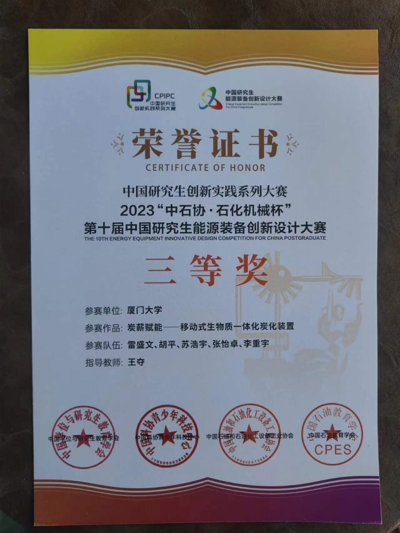 9月16日至17日,“中石协·石化机械杯”第十届中国研究生能源装备创新设计大赛全国总决赛在中国石油大学(华东)落下帷幕。经过紧张激励的角逐,代表厦门大学入围本次决赛的我院项目“炭薪赋能----移动式生物质一体化炭化装置”获得三等奖。