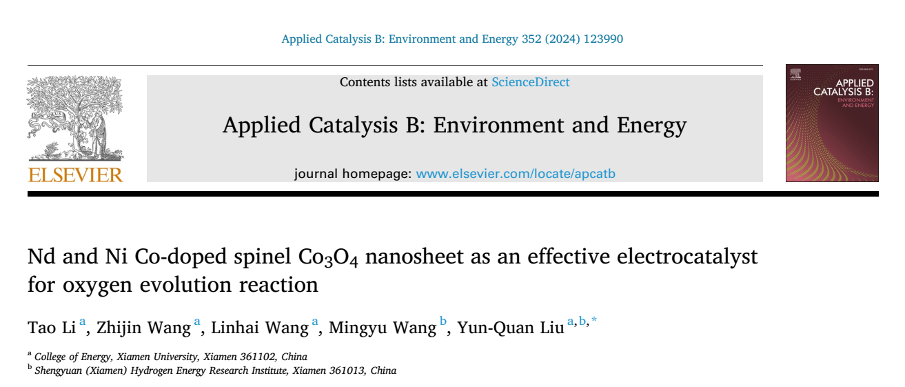 近日,我院刘运权教授团队在尖晶石氧化物表面重构方面的研究取得新进展,相关成果以 “Nd and Ni Co-doped spinel Co3O4 nanosheet as an effective electrocatalyst for oxygen evolution reaction” 为题发表于Applied Catalysis B: Environment and Energy上,该期刊是催化领域的顶尖期刊之一。