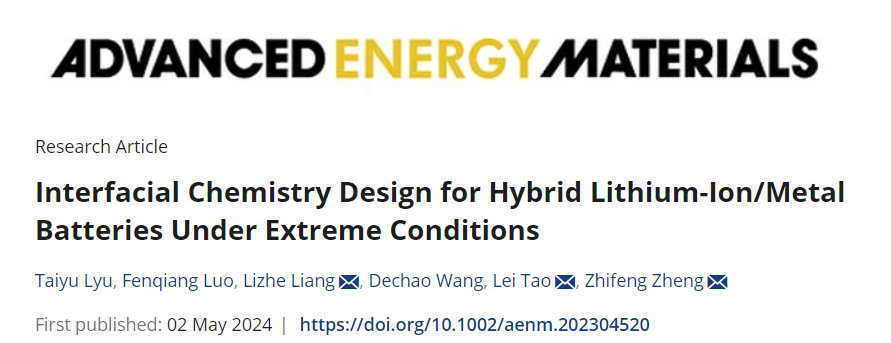 该工作以“Interfacial Chemistry Design for Hybrid Lithium-ion/Metal Batteries under Extreme Conditions”为题发表在国际知名期刊“Advanced Energy Materials”上。我院2021级博士生吕泰裕、2020级博士生罗奋强为该论文共同第一作者,郑志锋教授、弗吉尼亚理工大学陶磊博士、广西大学梁立喆老师为论文的共同通讯作者。论文还得到王德超老师的支持和帮助。该论文得到国家自然科学基金项目(No.31870570)和福建省科技计划项目(No.2020H4026, No.2022H6002)的支持。