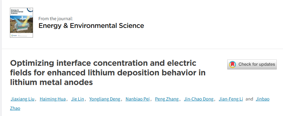 近日,我院张鹏教授、董金超教授、李剑锋教授及化学化工学院赵金保教授团队合作在锂金属负极电极/电解液界面研究方面取得新进展,相关成果以“Optimizing interface concentration and electric fields for enhanced lithium deposition behavior in lithium metal anodes”为题发表在Energy & Environmental Science。