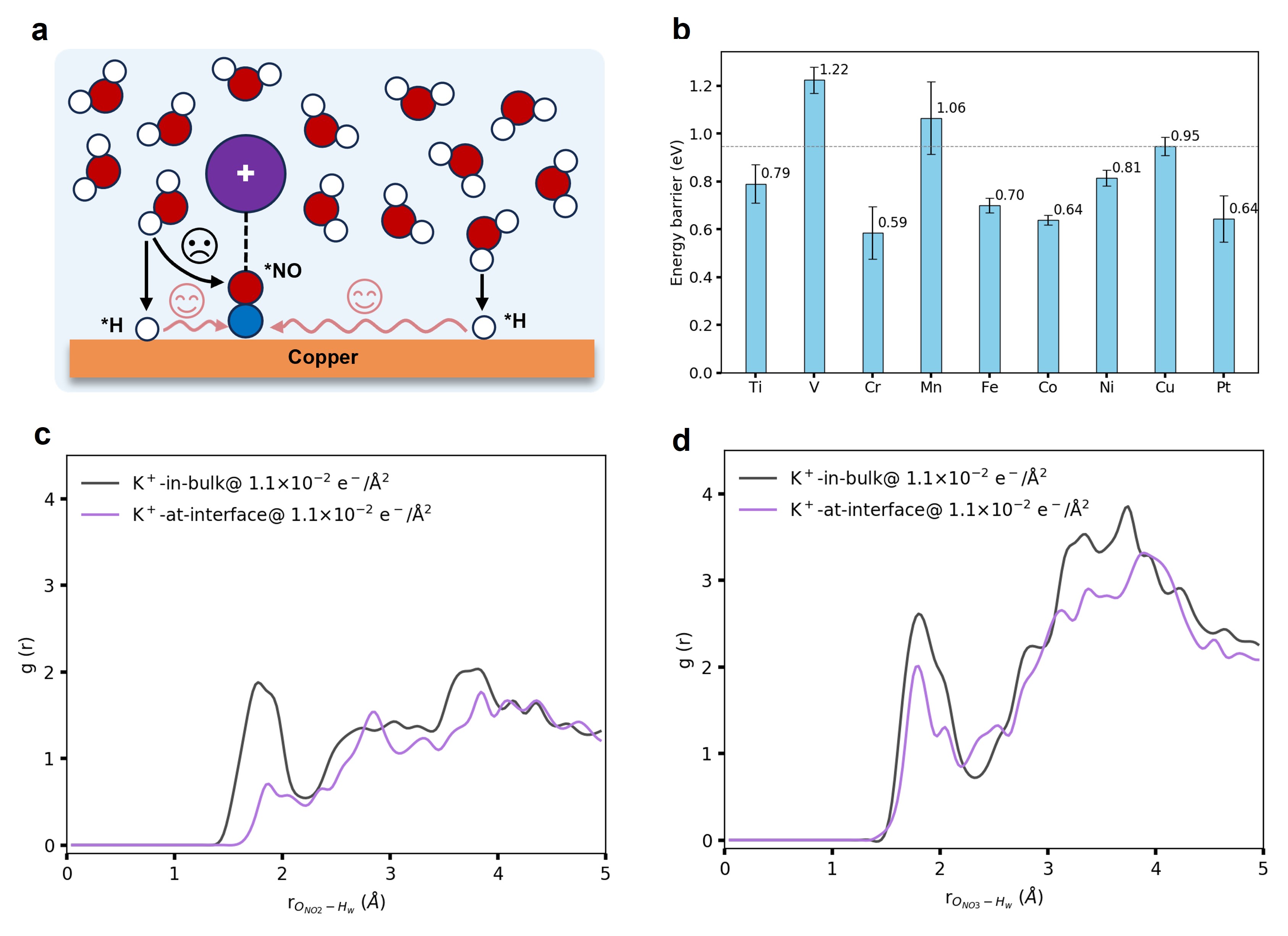 团队利用第一性原理分子动力学方法,对Cu上NO3RR还原过程的微观反应机理进行了详细研究。NO3RR的关键含氧中间体(如*NO3、*NO2和*NO)会与K+阳离子稳定配位,由于空间位阻,这阻碍了它们与氢键网络的结合,导致通过界面水对其进行氢化(ER机理)的能量显著上升;*H可以以较低的能垒在界面迁移,并且其与含氧物种的氢化(LH机理)能垒不受阳离子的影响,为氢化过程提供了有力的补充,成为*H促进NO3RR反应动力学的主要因素。该研究为通过调控离子-水-反应物种相互作用以改善铜基催化剂NO3RR活性提供了底层见解。
