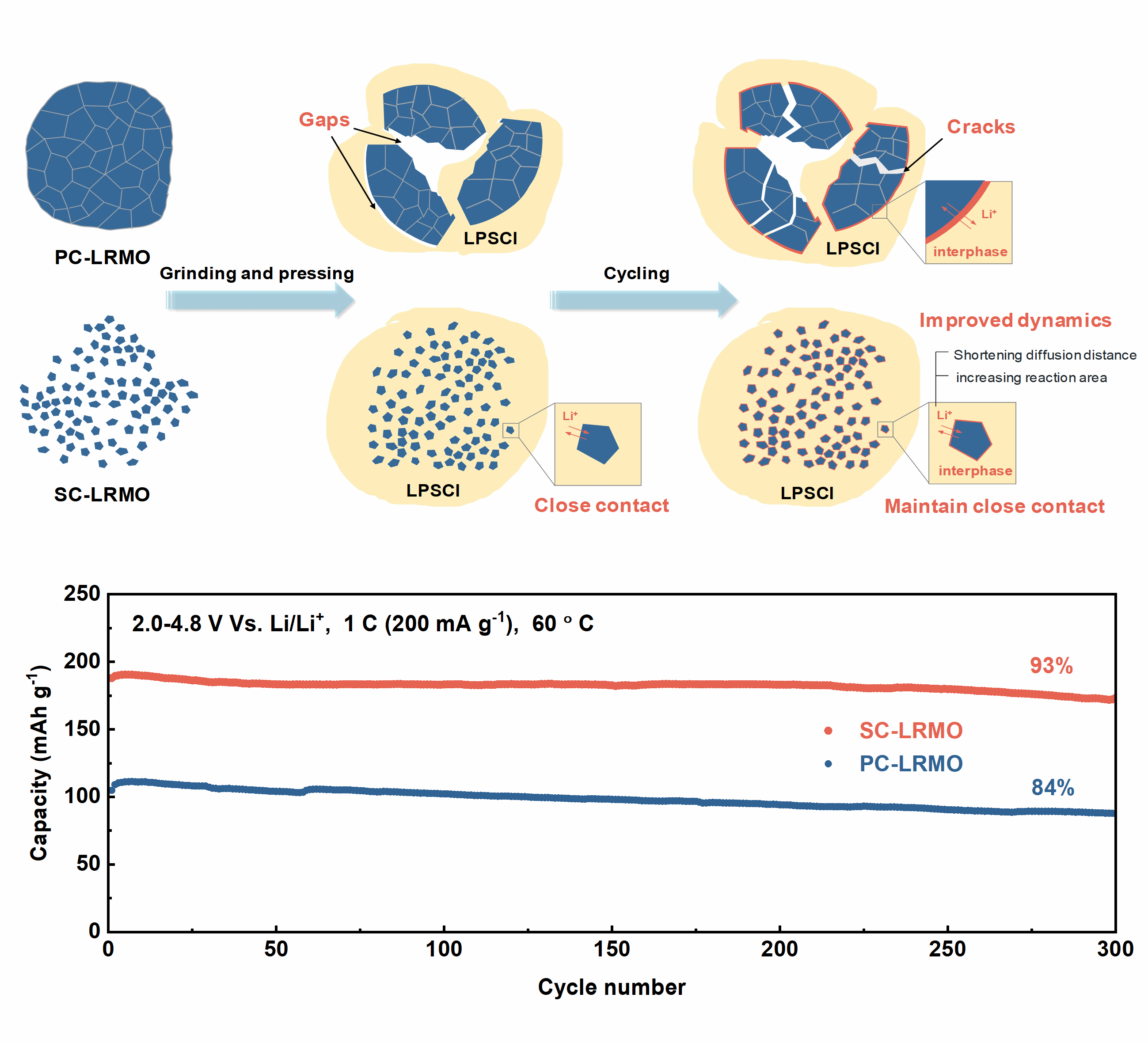 该团队制备了单晶富锂锰基层状氧化物(SC-LRMO,Li1.2Ni0.13Mn0.54Co0.13O2)作为硫化物基全固态锂电池的正极材料。电化学测试结果表明:小尺寸的SC-LRMO不仅在0.05 C的可逆容量可以达到316 mAh g−1,且在1 C下经过300圈循环后的容量保持率高达86%,优于传统的PC-LRMO(243 mAh g−1, 84%)。表征分析表明,小尺寸的单晶富锂正极不仅有效缩短Li+扩散距离、避免晶界对锂离子扩散的影响,并增加电化学反应活性面积;还具备更有利的微观结构,有助于缓解电池循环过程中电化学-机械力学效应导致的材料结构劣化。因此,SC-LRMO正极在硫化物基全固态锂电池中能够维持良好的电化学性能。总之,本工作强调了形貌和粒径控制在提高LRMO正极电化学性能的重要性,为开发高性能、高能量密度的全固态锂电池提供了重要的借鉴。