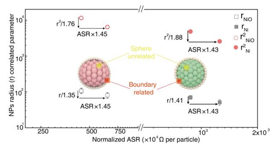 团队通过对一系列通过析出异质纳米颗粒(特别是Ni和NiO)增强的钙钛矿薄膜平台(La0.4Ca0.4Ti0.94Ni0.06O3, LCTN)进行了CO2电还原反应活性的定量分析。跨尺度电化学表征结合密度泛函理论(DFT)建模清楚地表明,纳米颗粒/钙钛矿界面的边界长度与CO2还原反应活性(CO2RR)严格相关。在NiO/LCTN界面的每个活性位点上,固有反应速率的周转频率(TOF)在800℃下达到了7.05±0.75×104 s-1,比Ni/LCTN和LCTN分别高出2.5倍和4个数量级。近常压X射线光电子能谱(NAP-XPS)耦合原位电化学测试进一步揭示了NiO/LCTN界面在稳定氧化碳中间体、提高偶发碳的起始电位阈值以及防止积碳方面的重要作用。