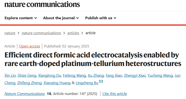 近日,我院卜令正副教授、郑志锋教授团队在直接甲酸燃料电池催化剂研究中取得新进展,相关成果以 “Efficient direct formic acid electrocatalysis enabled by rare earth-doped platinum-tellurium heterostructures” 为题发表在国际顶级期刊Nature Communications上。