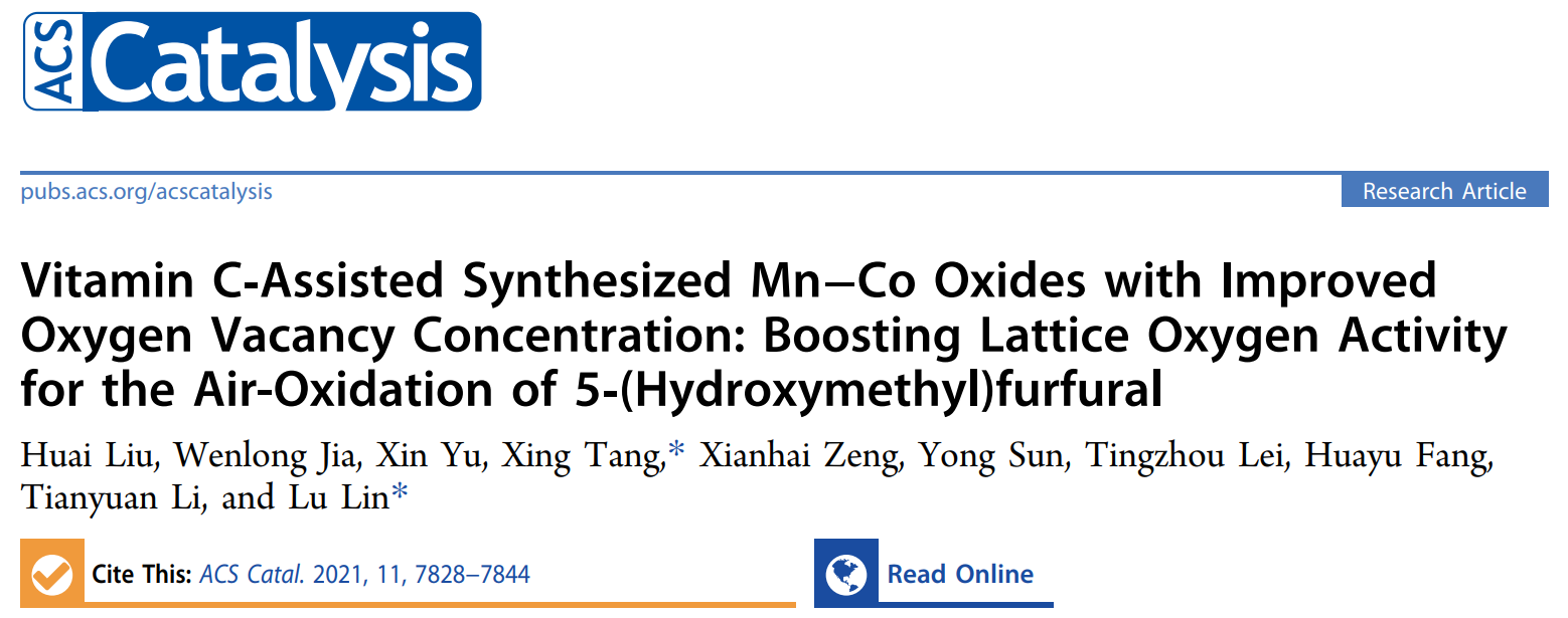 近日,能源化工研究所生物质燃料与化学品研究团队在新型生物质基聚酯单体研究中取得新进展,研究成果以“Vitamin C-Assisted Synthesized Mn−Co Oxides with ImprovedOxygen Vacancy Concentration: Boosting Lattice Oxygen Activityfor the Air-Oxidation of 5 (Hydroxymethyl)furfural”为题在线发表在美国化学会催化领域旗舰期刊《ACS Catalysis》。