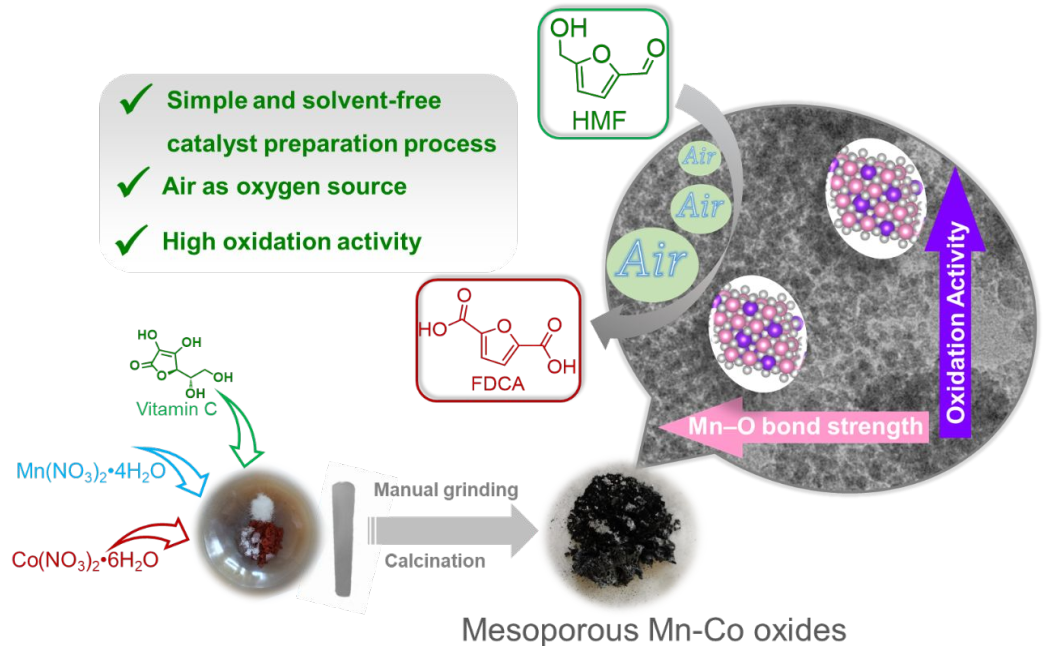 通过催化氧化生物质基平台分子5-羟甲基糠醛(HMF)制备得到的2,5-呋喃二甲酸(FDCA)是一种极具应用前景的可再生聚合单体,近年来相关研究吸引了学术界和工业界的广泛关注。但目前用于合成FDCA的催化剂仍然以贵金属催化剂为主,开发廉价高效的非贵金属催化剂依然非常具有挑战性。鉴于此,针对非贵金属Mn基催化剂催化效率低的难题,该研究中设计了一种维生素C(VC)辅助的研磨法制备了富含氧空位的介孔Mn-Co氧化物催化剂,其在空气氧条件下可以高效催化氧化HMF,FDCA得率可达96%(130 °C,3 h,1.5 MPa 空气)。值得注意的是,上述Mn-Co氧化物催化条件下的FDCA生成速率高达2611 μmol‧g-1‧h-1,这一数值是其他锰基催化剂的2.7-24.9。