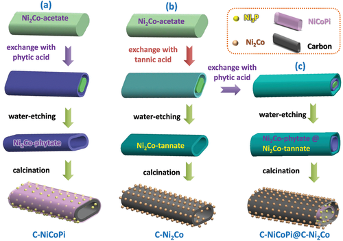 图1:三种材料合成路线示意图:a)C–NiCoPi, b) C–Ni2Co, c) C–NiCoPi@C–Ni2Co