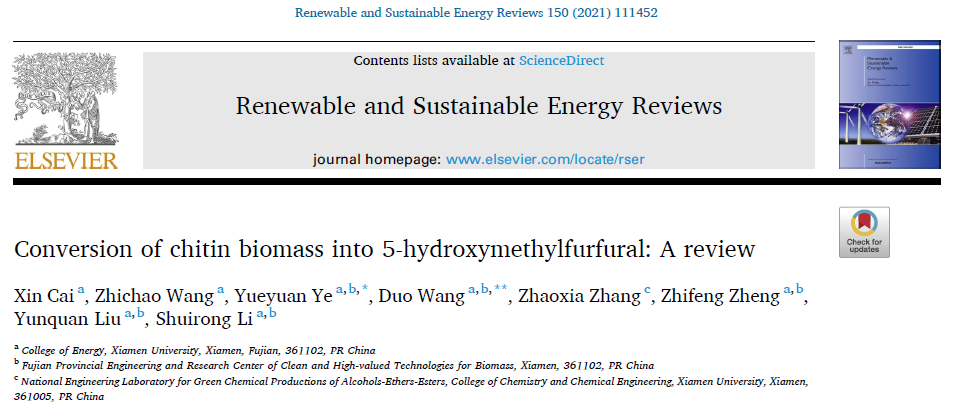 近日,我院郑志锋教授团队撰写的综述性论文“Conversion of chitin biomass into 5-hydroxymethylfurfural: A review”发表于《Renewable and Sustainable Energy Reviews》(DOI号:10.1016/j.rser.2021.111452)。该文系统地归纳总结了几丁质转化为5-羟甲基糠醛的常见工艺技术及催化剂-溶剂组合体系,并对当前所面临的挑战和未来的研究方向进行了深入的探讨。
