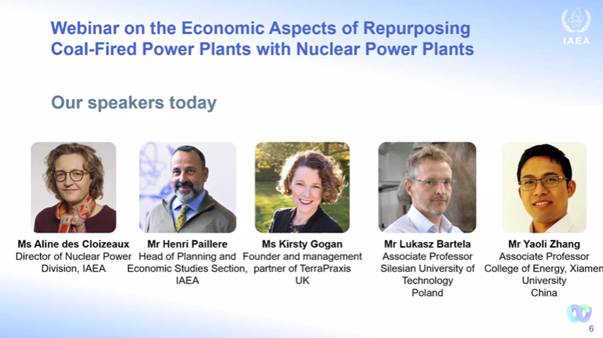 当地时间4月5日下午1:30(北京时间4月5日晚7:30),IAEA举办了“Economic Aspects of Repurposing Coal-Fired Power Plants with Nuclear Power Plants”在线会议。会议组委会成员包括:IAEA核电事业部主任Aline Des Cloizeaux,IAEA经济计划研究所主任Henri Paillere,英国TerraPraxis公司创始人Kirsty Gogan,波兰Silesian技术大学副教授Lukasz Bartela,以及我院副教授张尧立。本次会议的目的在于探讨使用核能对火电站进行脱碳化改造对于全球尽快实现“碳中和”的重要作用。来自世界各国近200位专家学者参与了此次在线会议。