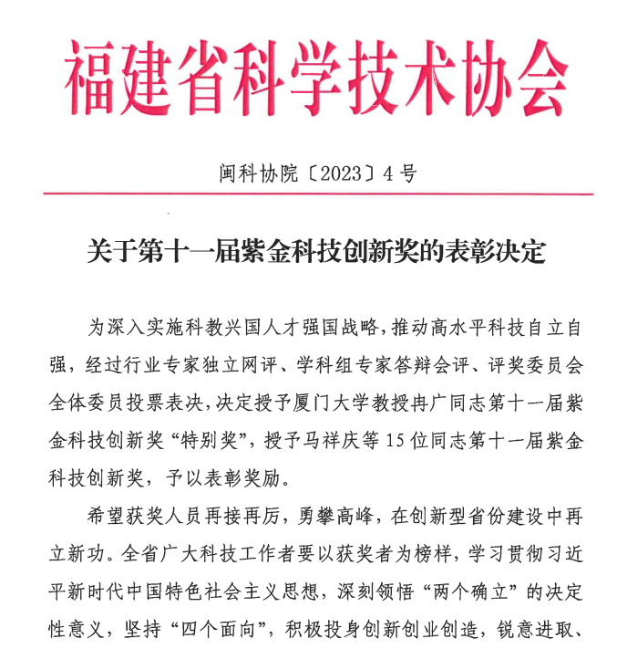 原文链接:关于第十一届紫金科技创新奖的表彰决定https://www.fjkx.org/newsinfo.aspx?id=4057B94A79E90BA7