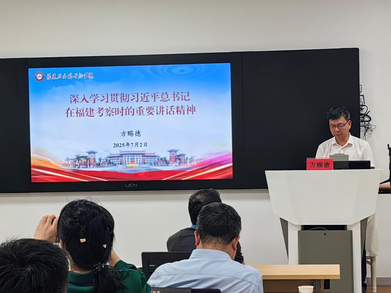 当晚,中共漳州市委党校方赐德教授为师生作《深入学习贯彻习近平总书记在福建考察时的重要讲话精神》专题辅导。方教授详细解读习近平总书记关于新时代新征程福建干什么、福建怎么干、福建党员干部应如何担当作为等重大问题的重要指示精神。他以习近平总书记四次赴闽考察为主线,聚焦“四个更大”战略要求与“奋勇争先”改革嘱托,通过对比1996年习近平同志肯定漳州“大农业开发”的历史论述与澳角村振兴实践,深刻揭示“产业振兴要立足资源多样性”的科学规律。他引用《之江新语》“要善于学典型”重要论述,号召师生将谷文昌精神化为行动自觉,在服务“新质生产力绿色赋能”中勇担使命。两个半小时的授课,师生们表示意犹未尽、收获满满。